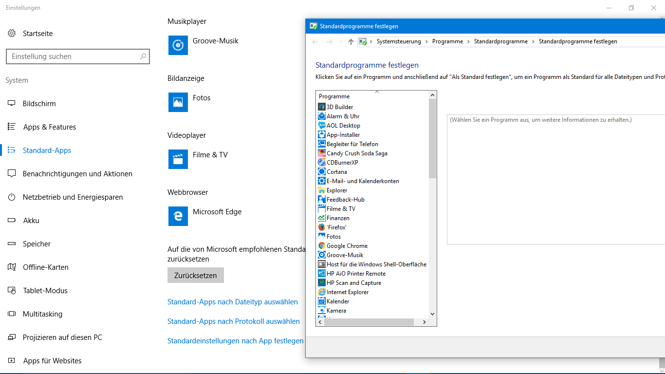 Ich habe das Problem, seitdem ich Firefox deinstalliert habe, kann ich kein anderen Browser als Standardprogramm in Windows 10 einstellen.