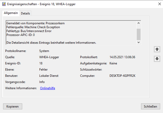 Mir geht's mittlerweile um die Meldung über den schweren Hardwarefehler, denn der Kernel-Power-Fehler wird ja offensichtlich von diesem ausgelöst jedes mal, also der Hardwarefehler führt zum plötzlichen Restart und momentan sieht es für mich so aus, dass die CPU einen Schuss hat.