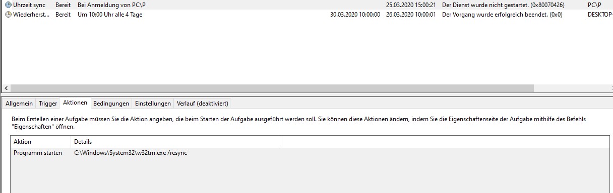 Ich habe das Problem, dass die Windows Uhrzeit um eine Stunde falsch eingestellt ist, wenn ich ein Linux live OS vom USB Stick starte und dann wieder Windows hochfahre. Im UEFI ist die Uhrzeit korrekt. Nun wollte ich vom Aufgabenplaner die Uhrzeit beim Anmelden synchronisieren lassen (siehe Screenshot). Dieser meldet aber, der "Der Dienst wurde nicht gestartet". Welcher Dienst ist damit gemeint? Der "Windows Zeitgeber" steht auf automatisch (auch manuell habe ich ausprobiert)