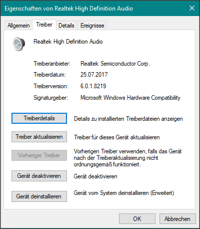 Wenn ich hingegen unter Audio, Video, Gamecontroller den Realtek High Definition Audio Treiber aufrufe, dann hat sich dort die Version in der Tat nicht geändert und ist bei mir immer noch 6.0.1.8219 vom 25.7.17. Das "Spielzeug", der HD Audio Manager von Realtek existiert bei mir auch weiterhin noch in der Systemsteuerung und in der Task-Leiste (roter Lautsprecher neben dem weißen Lautsprecher).