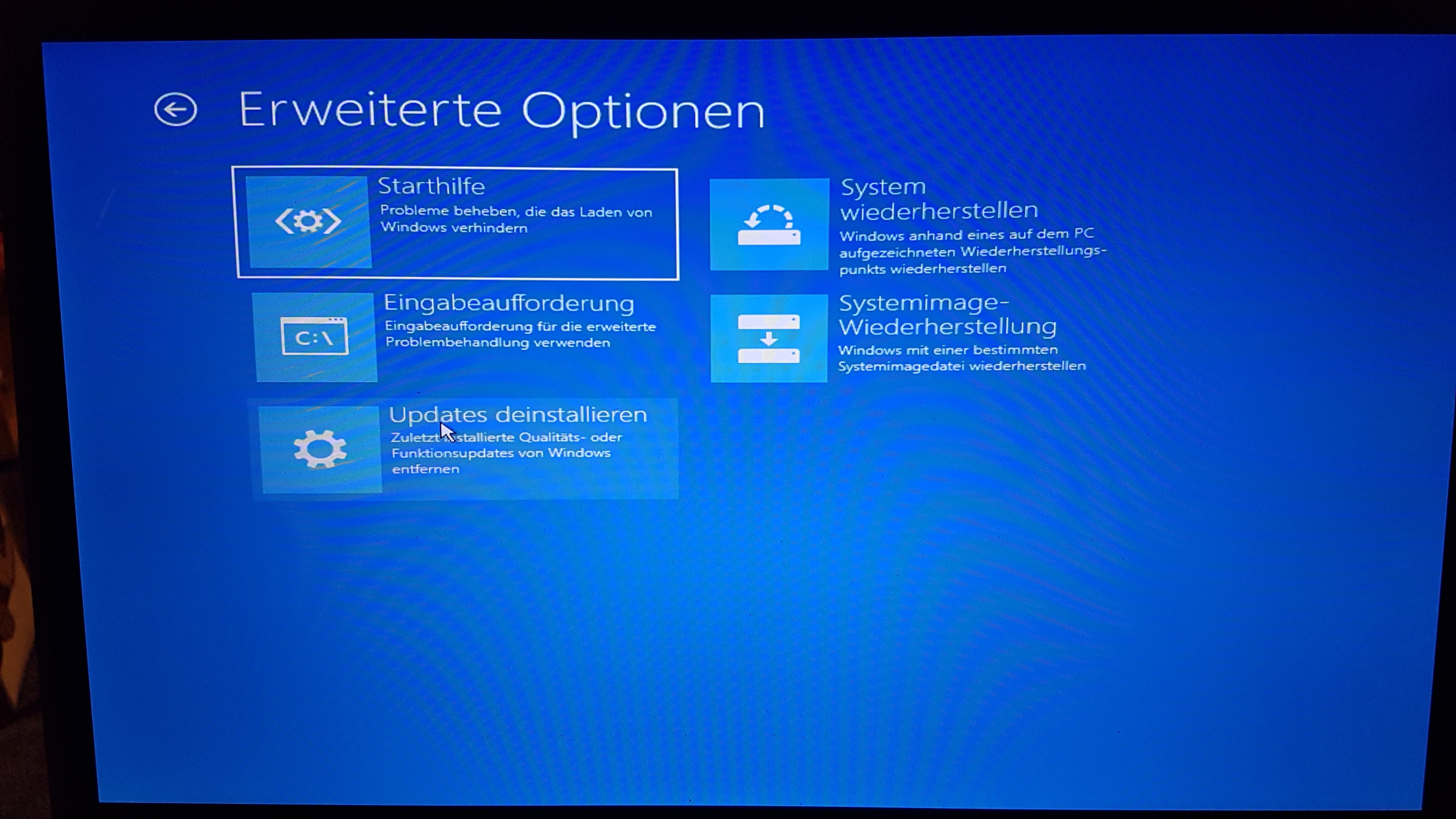 Ich kann diesen auch booten, jedoch hilft mir das erweiterte Startmenü nicht weiter. Es fehlt bei mir der Punkt Starteinstellungen.