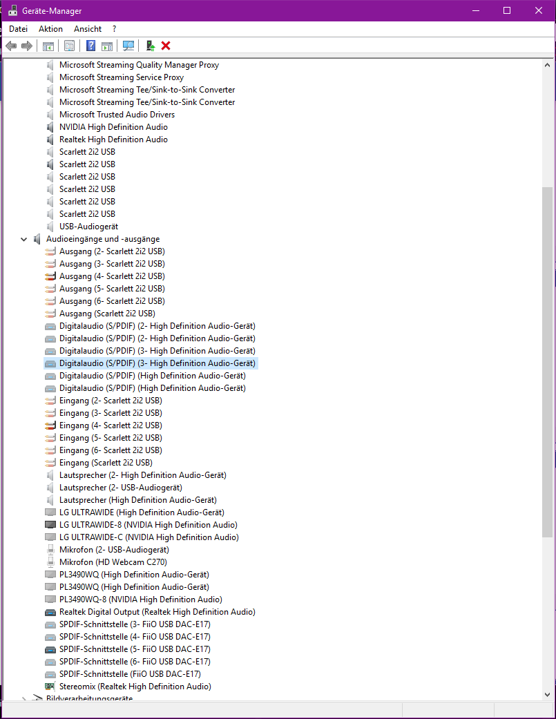 Scarlett 2i2, Fiio E17, Nvidia Monitor Treiber per DP 1.2, Onboard Soundkarte von Realtek.