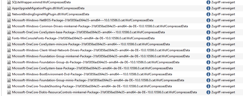 Dabei zeigt mir G Data endlos viele Dateien an, auf denen der Zugriff verweigert wurde; was ich davon halten soll, weiß ich jetzt auf Anhieb nicht so genau ! Hauptsächlich handelt es sich dabei um Dateien mit "Windows ....." oder "System ... compressed" - es gibt aber auch andere Dateien.