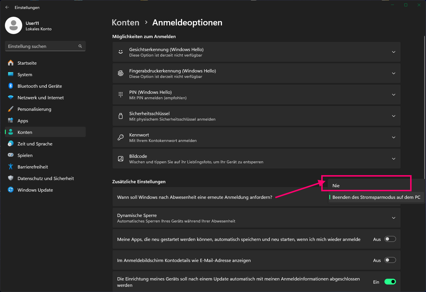 Einstellungen → Konten → Anmeldeoptionen