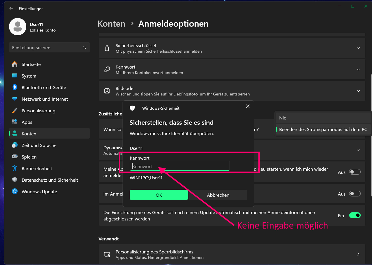 Die Anmeldeoption habe ich noch Anfang Dezember ohne Problem benutzt, um auf „Nie“ umzustellen, damit ich den PC nach dem Aufwachen aus dem Engergiesparmodus ohne unnötige Eingabe des Benutzerkennworts gleich weiterbenutzen kann.