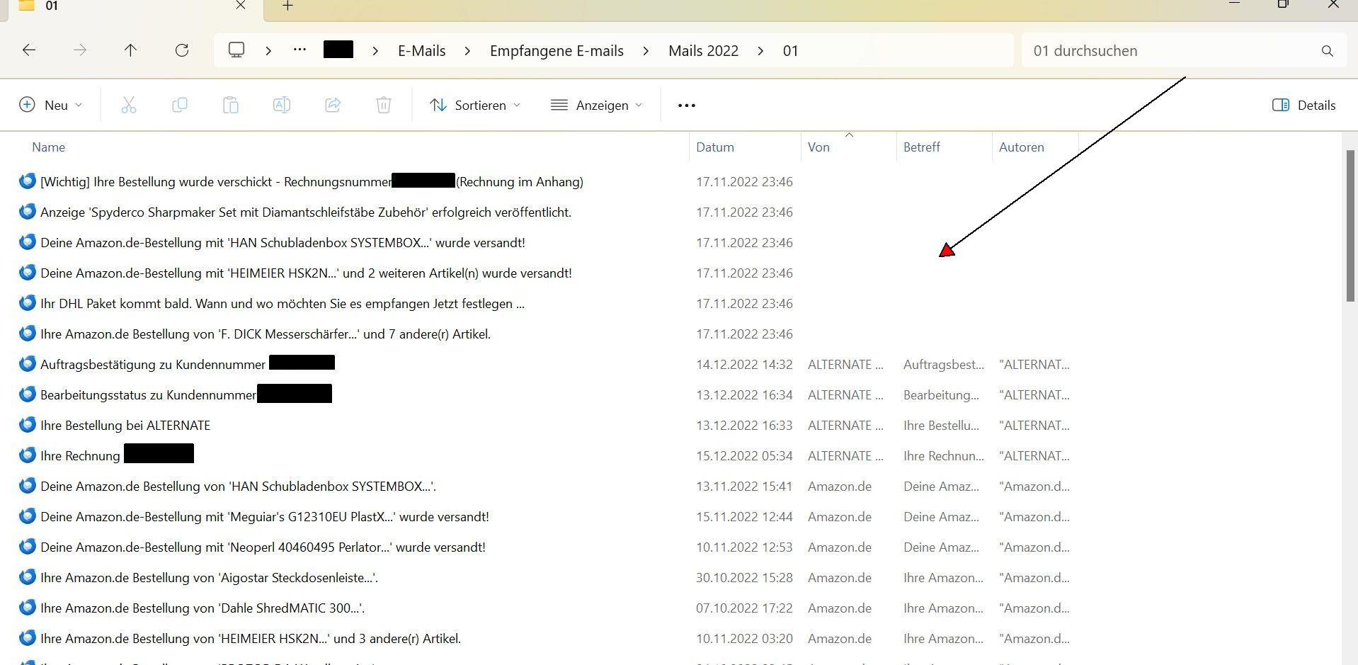 win 11 e-mails Ordner keine Anzeige Betreff und co...