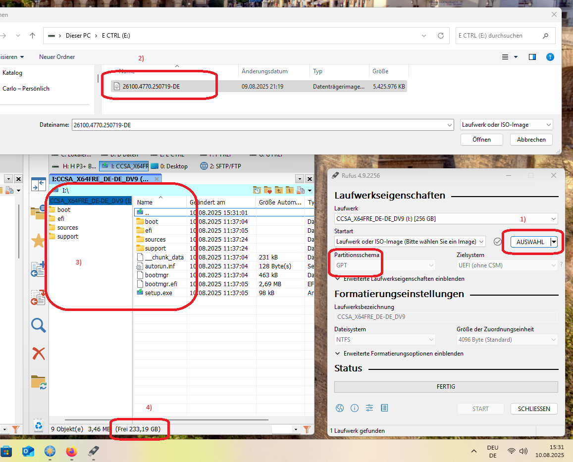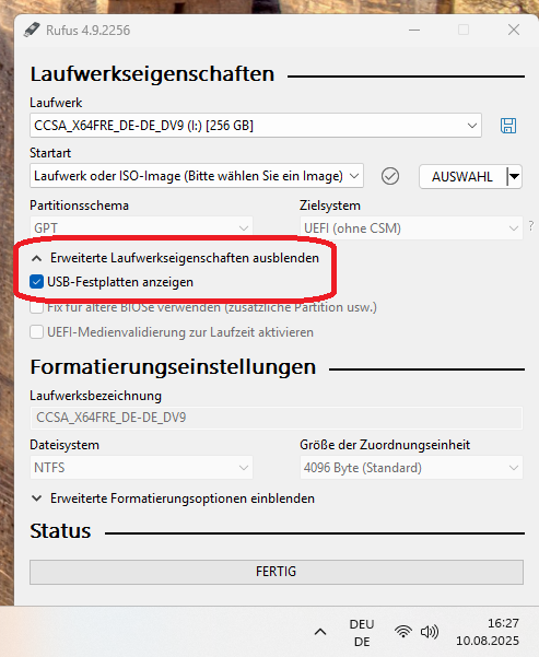 Moment, bei Rufus brauchst du noch eine Einstellung, da musst du bei Erweiterte Laufwerks.... noch USB-Festplatten anhaken.
