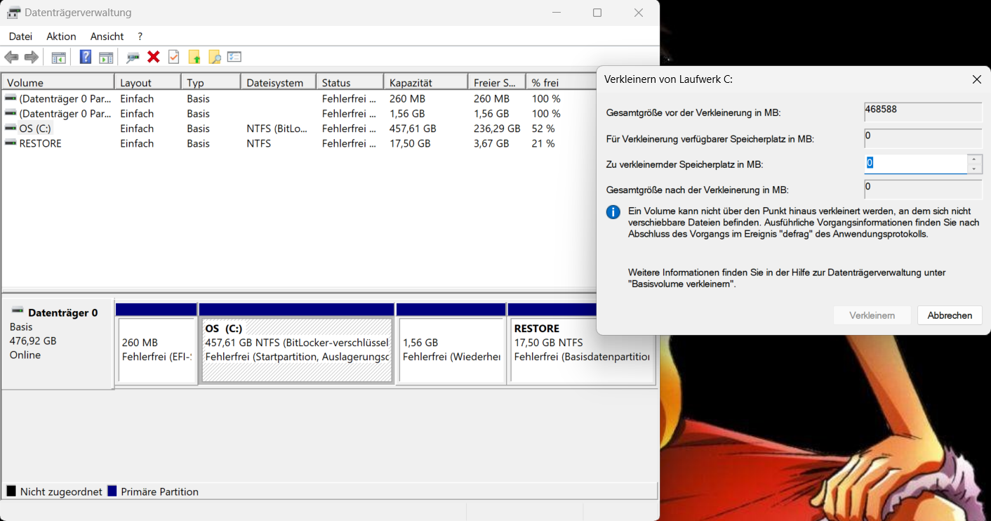 ich will mein C-Laufwerk verkleinern, um eine neue Partition zu erstellen. Wie ihr an dem Screenshot sehen könnt, ist leider die Funktion "verkleinern" ausgegraut (edit: auch, wenn ich da einen Wert von bspw. 204800 eingebe) und ich weiß nicht, warum. Es ist NTFS, über 200GB freier Speicherplatz auf dem Laufwerk...