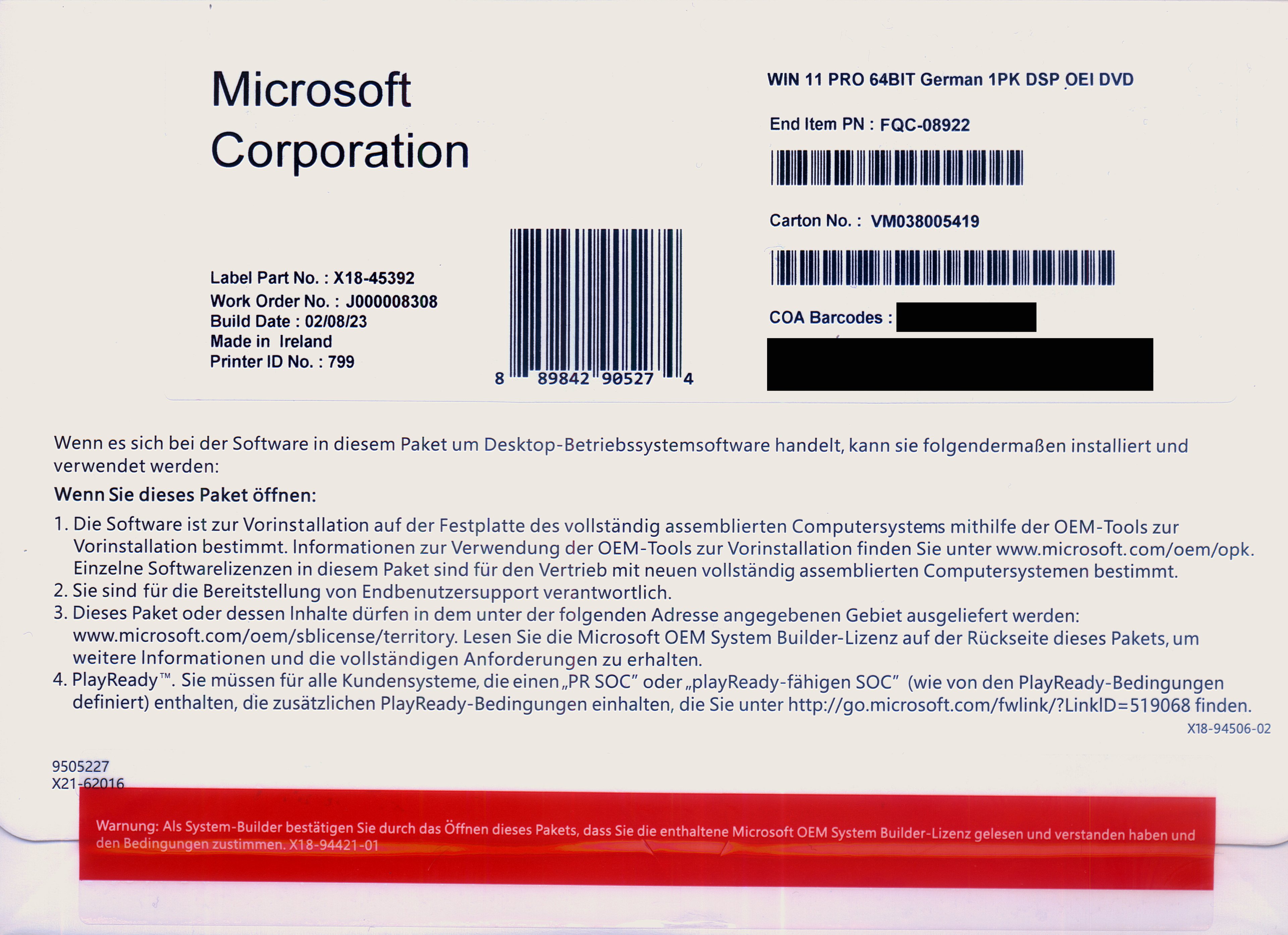 ich habe aus bekannten Gründen zwei System-Builder-Versionen von Win 11 Pro erworben. Sehen und fühlen sich genauso an wie meine DSPs von Win8.x und 10, aber mir ist zufällig aufgefallen, dass die aufgedruckte PN nicht stimmt.