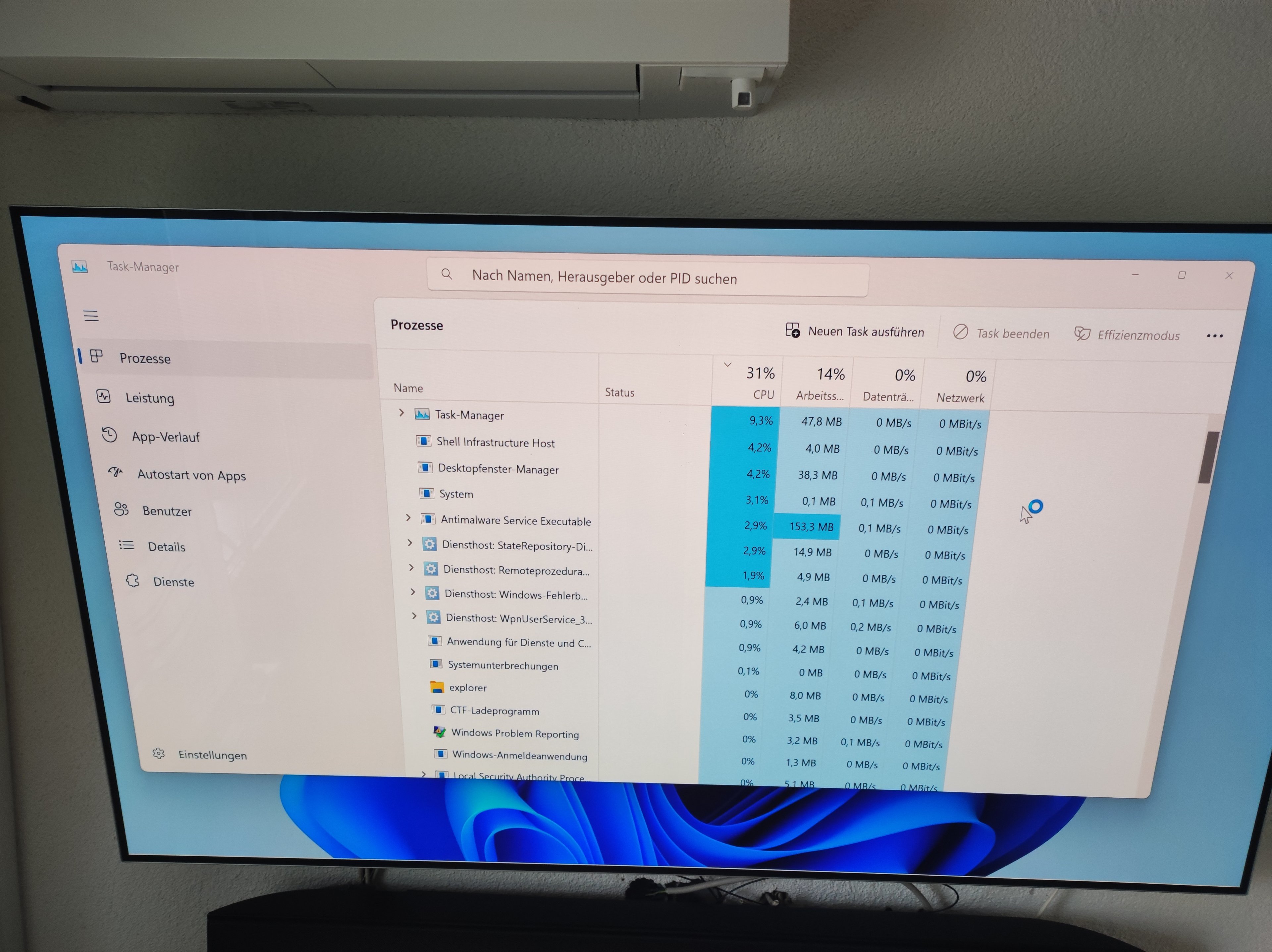 mein Windows 11 schafft es nicht mehr bis zum Desktop. Der PC bootet bis zum Anmeldescreen und nach Eingabe der PIN macht er das wie im Video gezeigt. Man sieht es nicht. Er wechselt von weißem Hintergrund auf das Desktopbild und wieder zurück Das macht er dann auch über Nacht. Im Taskmanager (den ich erstaunlicherweise aufrufen kann) ist ganz schön was los