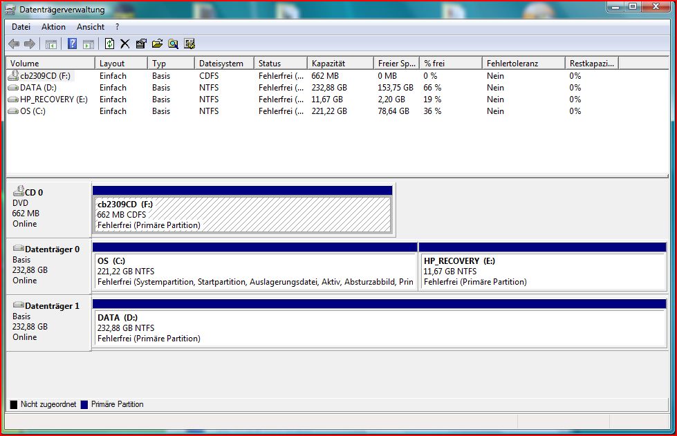 ich möchte nun mein neu erworbenes WIN 7 neben dem vorhandenen Vista auf mein HP Notebook als 2. Betriebssystem installieren. Ich habe zwei 250 GB Festplatten. Auf der ersten ist Vista und in einer weiteren Partition der Recoverybereich des Notebooks. Auf der zweiten Platte habe ich bisher meine Daten gespeichert. Nun wollte ich die zweite Platte in 2 Partitionen aufteilen und dann darauf WIN 7 installieren. Geht das überhaupt oder muss ich WIN 7 auf der ersten Platte installieren?