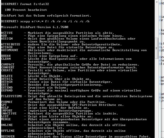 xcopy e:\*.* f: /k /r /e /i /s /c /h ein und drücke return. Es wird alles von e nach f kopiert. Du kannst den Befehl von hier mit der Maus markieren, kopieren und im "DOS"-Fenster per Rechtsklick einfügen, falls Du nicht abtippen willst. Es wird kopiert. Die Dateien laufen durch. boot.wim oder install.wim dauern SEHR lange, nicht wundern. Fertig in Screenshot 3. Der Stick kann nun beim Booten mit F8 angefahren werden. Windows 7 wird von Stick installiert.