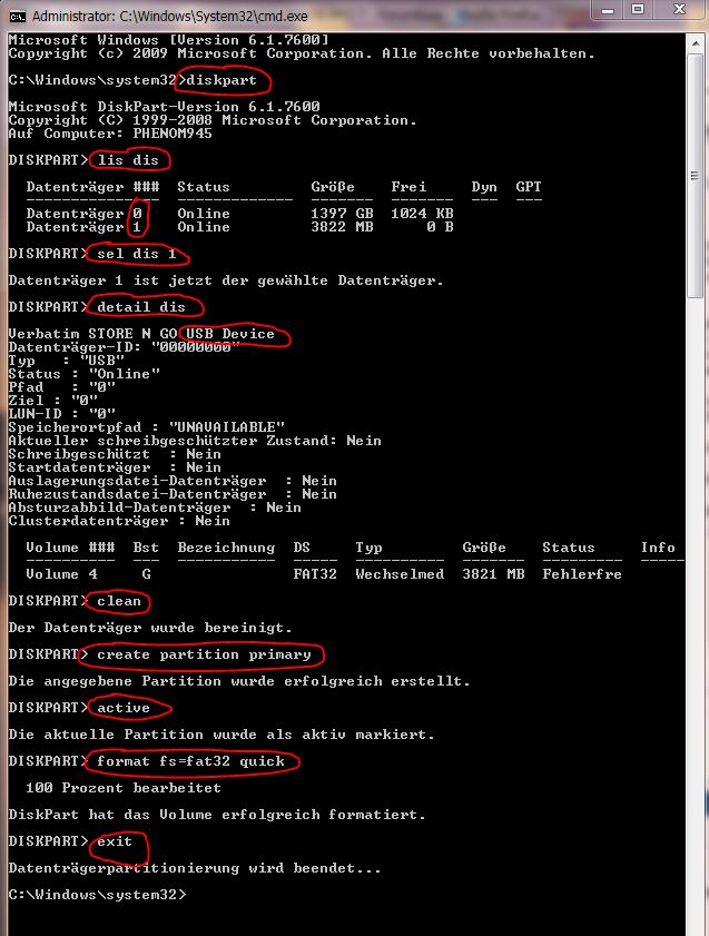format fs=fat32 quick eintippen und return drücken. Jetzt wird formatiert und man kann den Verlauf des Formatierens in Prozent sehen. Meldung: diskpart hat das Volume erfolgreich formatiert.
