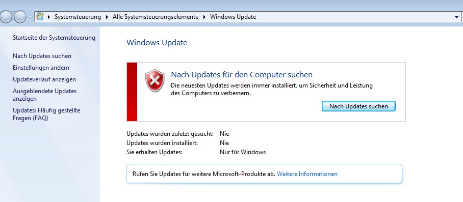 Clean-Install von Windows 7 Ultimate mit integriertem Service-Pack 1. Windows Update lässt sich nicht ausführen, d. h. es erscheint eine "Fehlermeldung" (siehe Bild 1). Wenn ich auf "Nach Updates suchen" klicke sucht er zwar nach Updates, findet aber auch nach mehreren Stunden keine!
