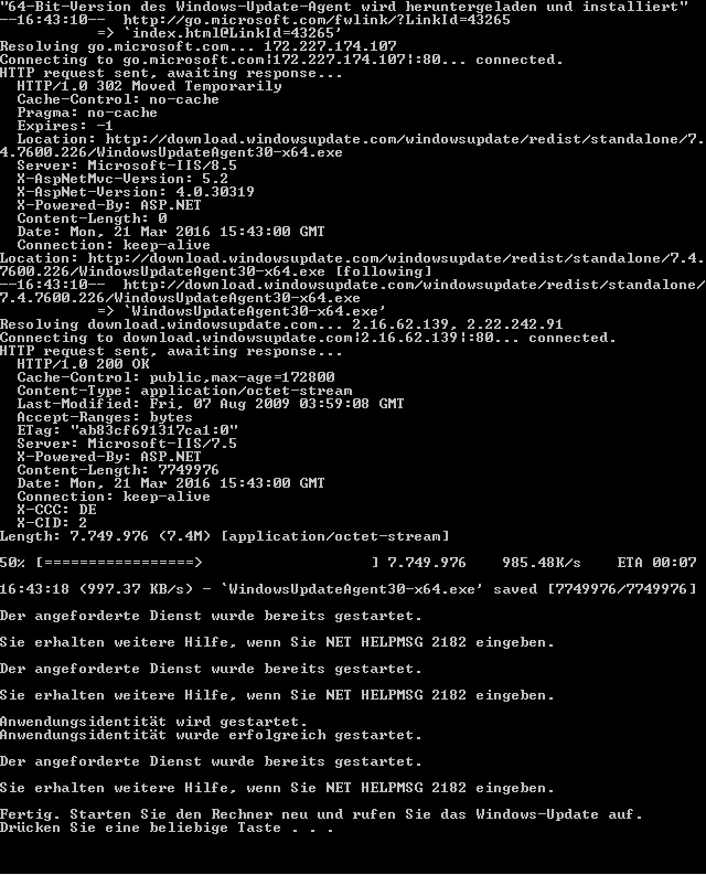 - den aktuellen Windows Update Agent 7.6 x64 von Microsoft heruntergeladen und installiert