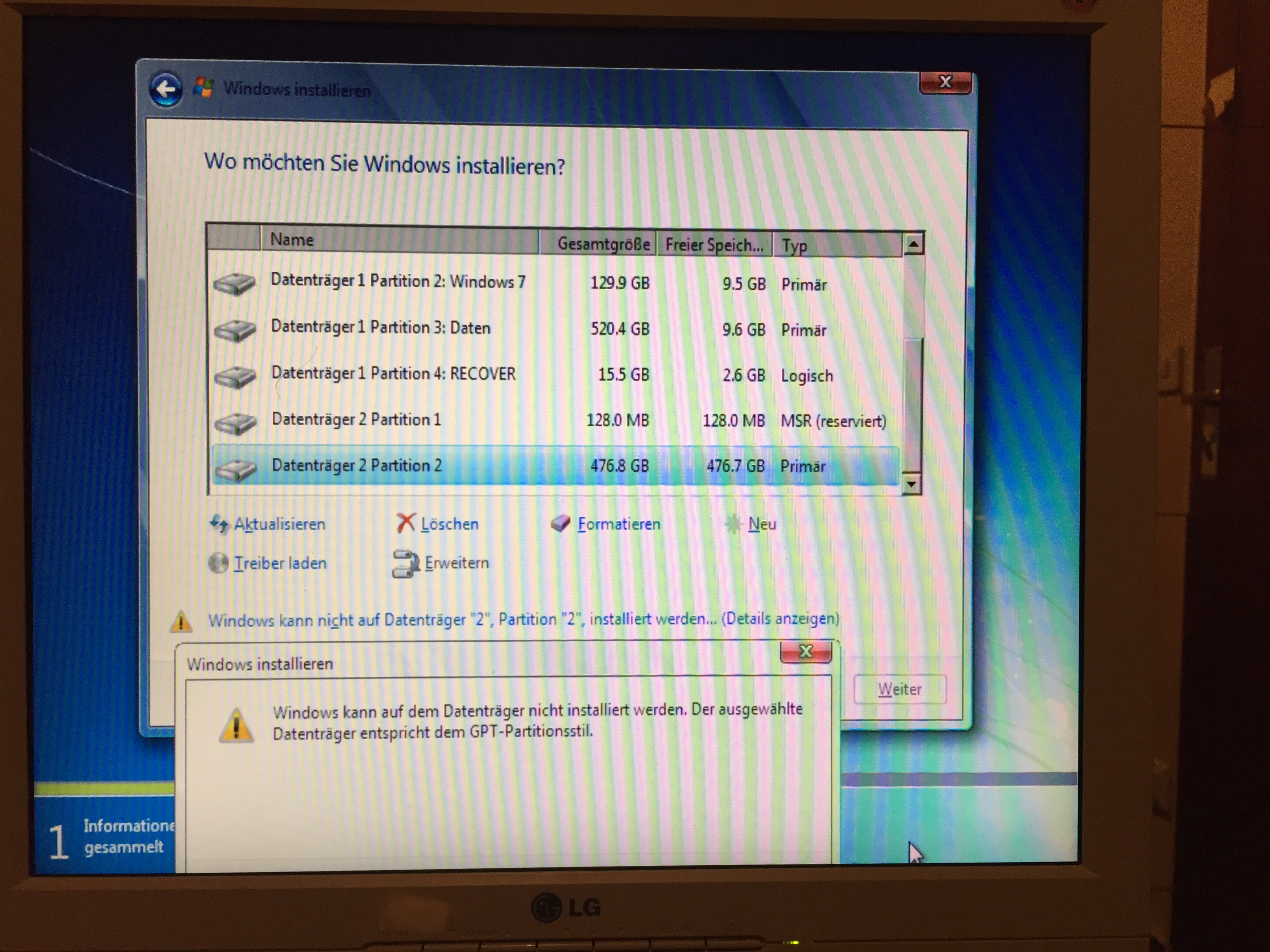 Jetzt bekomme ich bei der Installation die Fehlermeldung "Windows kann auf dem Datenträger nicht installiert werrden. Der ausgewählte Datenträger entspricht dem GPT-Partitionsstil."