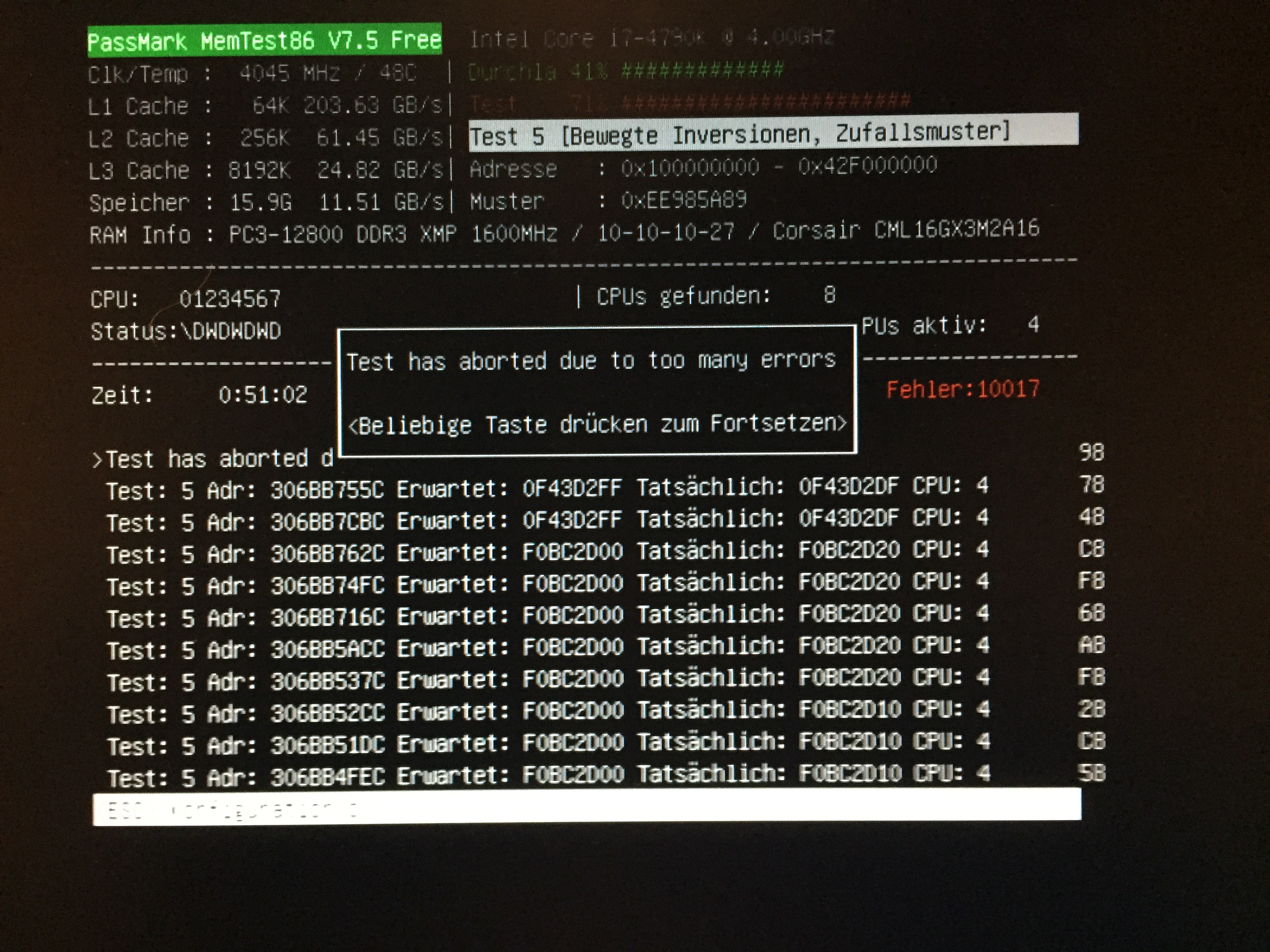 Ich habe mir Memtest86 7.5 runtergeladen. Zuerst lief die Vers. 4.3.7 und zeigte nach 2 Durchläufen 39810 Fehler an. Danach mit Vers. 7.5 wurde im 2ten Durchlauf bei Test 5 wegen zu vielen Fehlern (10017 Fehler) abgebrochen. Kann das denn sein, sind so viele Fehler überhaupt möglich ???