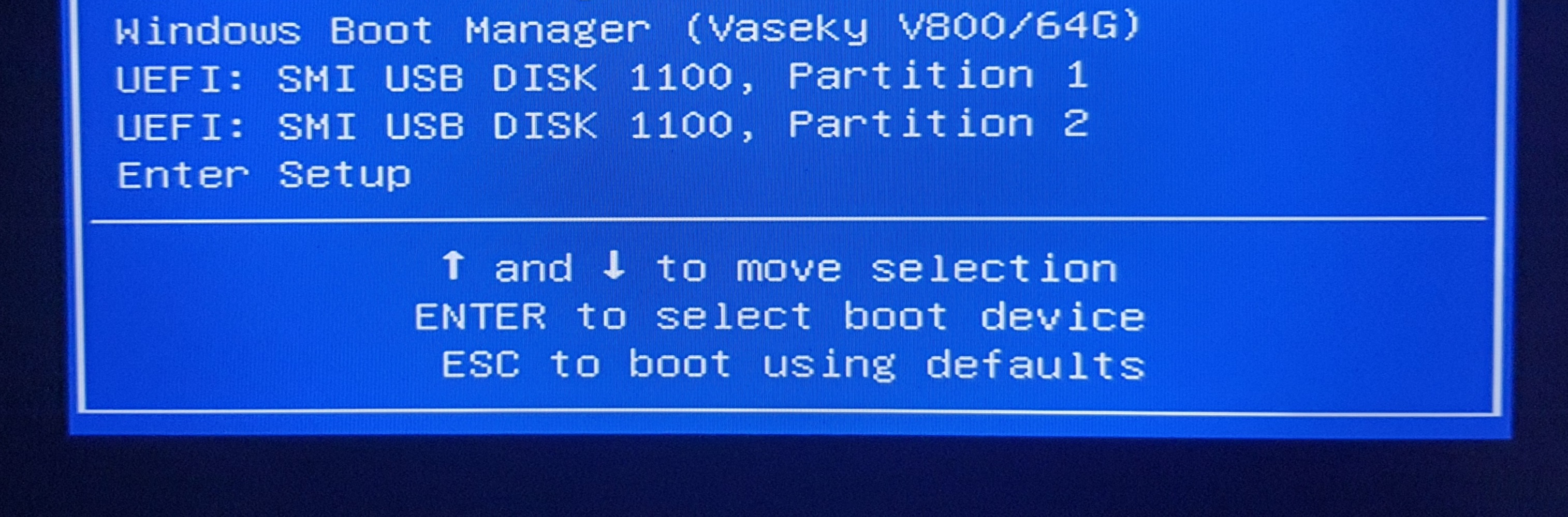 erhalten, indem ich die bootmgfw.efi kopiert habe, und nach E:\efi\BOOT (boot aus folder microsoft eine Ebene nach oben schieben und bootmgfw.efi zu bootx64.efi umbenennen) kopiert.