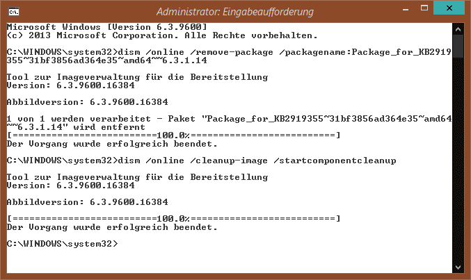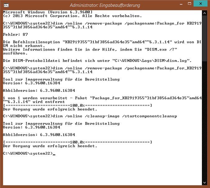 Meine Empfehlung ist, nach jedem installierten Paket einen Neustart durchzuführen. Das ist zwar typischerweise nicht erforderlich, da der Neustart bis zum letzten KB-Paket verzögert werden kann. Ich hatte aber den Fall, dass noch ausstehende Updates in der pending.xml die erfolgreiche Installation von KB2919355 verhinderten - und nach ca. 20 Minuten der Hinweis kam, dass das Update nicht erfolgreich durchgeführt werden konnte.