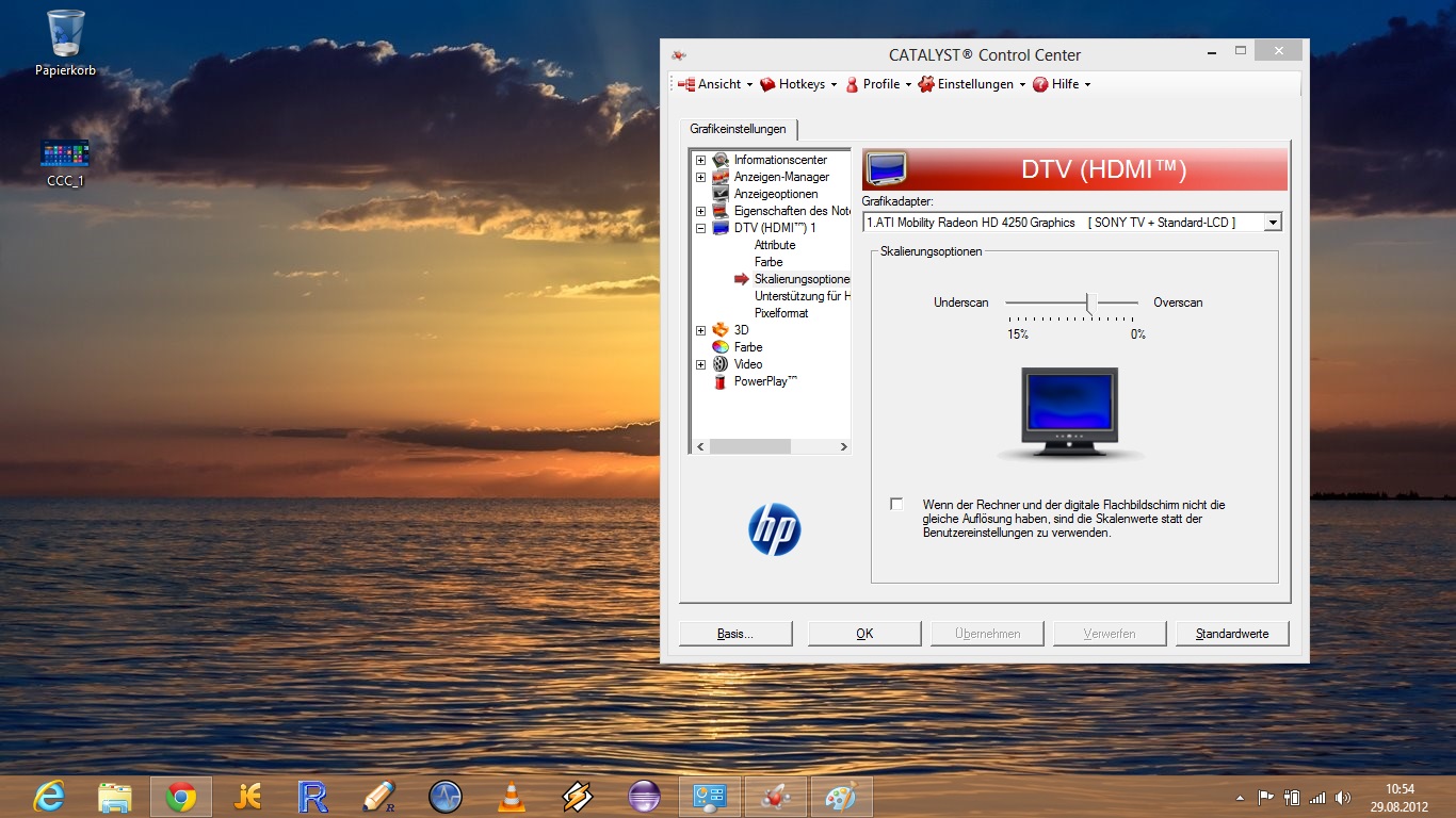 Ich habe folgendes Problem: vor kurzem habe ich Win8 Pro 32bit auf meinem Laptop installiert (Studentenversion). Nun gibt es Probleme mit dem CCC, es lässt sich zwar unter einem Kompatibilitätsmodus installieren, jedoch funktioniert es nicht richtig. Da ich meinen 40"-LCD (Sony BX400) angeschlossen habe, wird mir das Bild nicht bis an den Rand angezeigt (wie vermutlich das einige von euch wissen). IdR stelle ich das dann immer mit der Overscan-Funktion im CCC-Treiber so ein, das der gesamte Bildschirm ausgefüllt wird. Dies geht aber nicht, da sich CCC nicht ausführen lässt - kurzfristig gings zwar manchmal (mit Kompatibilitätsmodi) aber es gab immer wieder Probleme. Besteht die Möglichkeit dies einzustellen, ohne den CCC-Treiber? (in der Windows Registry oder sowas???)