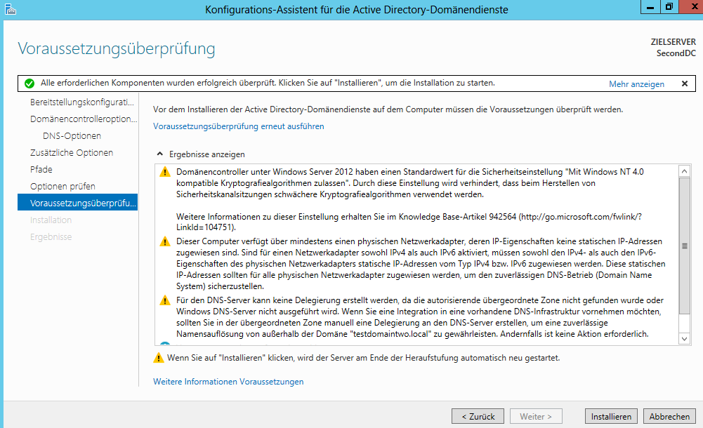 Ich habe in Virtual Box den Netzwerkadapter jeweils auf "Internes Netzwerk" gesetzt, da sich die Gast-Systeme nur gegenseitig sehen sollen - das klappt auch alles soweit. Nun habe ich dem zukünftigem DC noch keine statische IP zugewiesen und habe gleich angefangen die ActiveDirectory Domänen Rolle hinzuzufügen - hat auch geklappt.