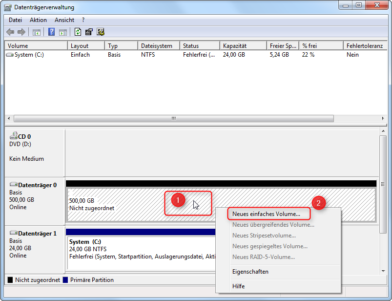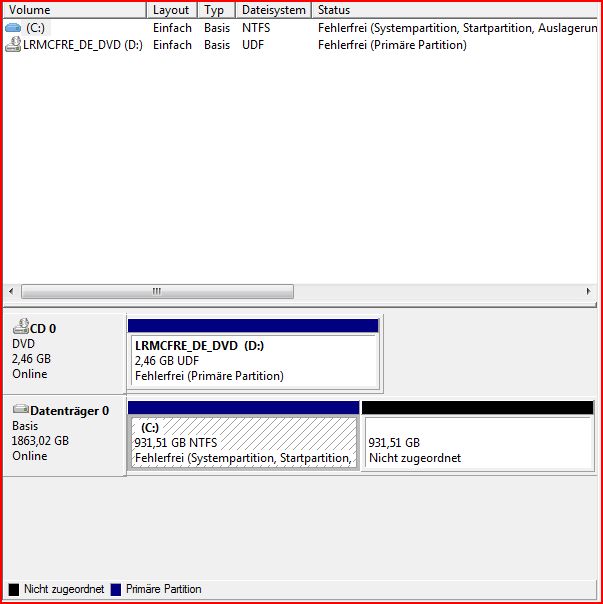 Dort wird mir die Systempartition angezeigt, auch dass der Rest nicht zugeordnet ist, aber ich kann nichts anklicken, hinzufügen, verändern oder sonstwas.
