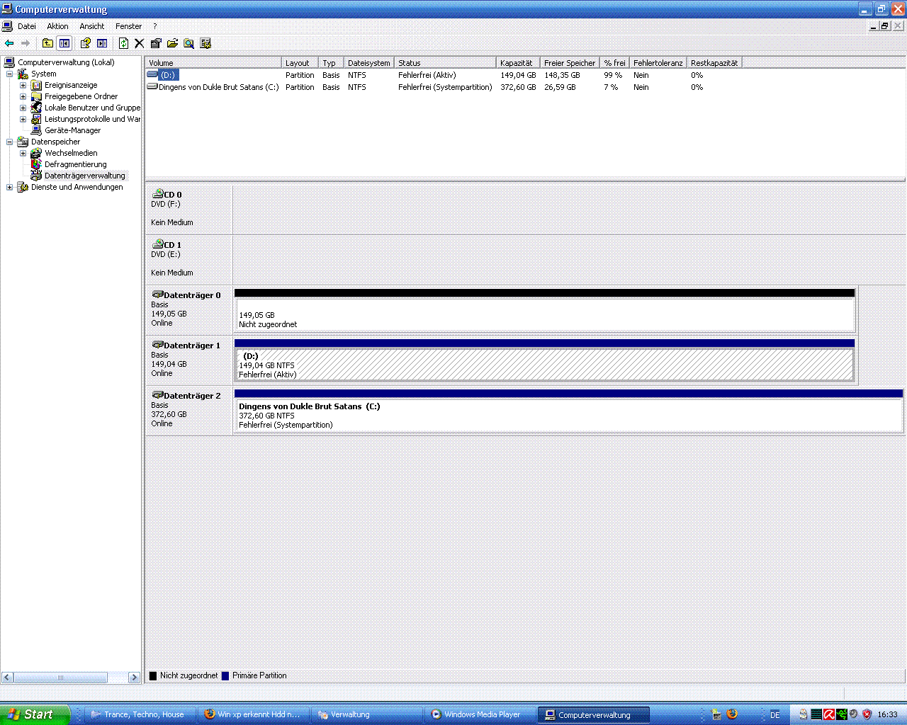 Ich habe den ganzen Sonntag schon gegoogelt und die foren suche benutz aber bin zu keinerlei Ergebniss gekommen. Mein Problem: Von einem Kollegen habe ich mir 2 Festpaltten ausgeliehen (2x WDC W16000 JD)Im Arbeitsplatz sehe ich aber nur einer der 2 Platten. HDD Life hingegen zeigt mir beide an. In der Computerverwaltung sehe ich die Festplatte mit der Zusatz information "nicht zugeordnet". Wie kann ich die Hdd zu ordnen oda an meinem Pc benutzen. Vielen Dank schonmal