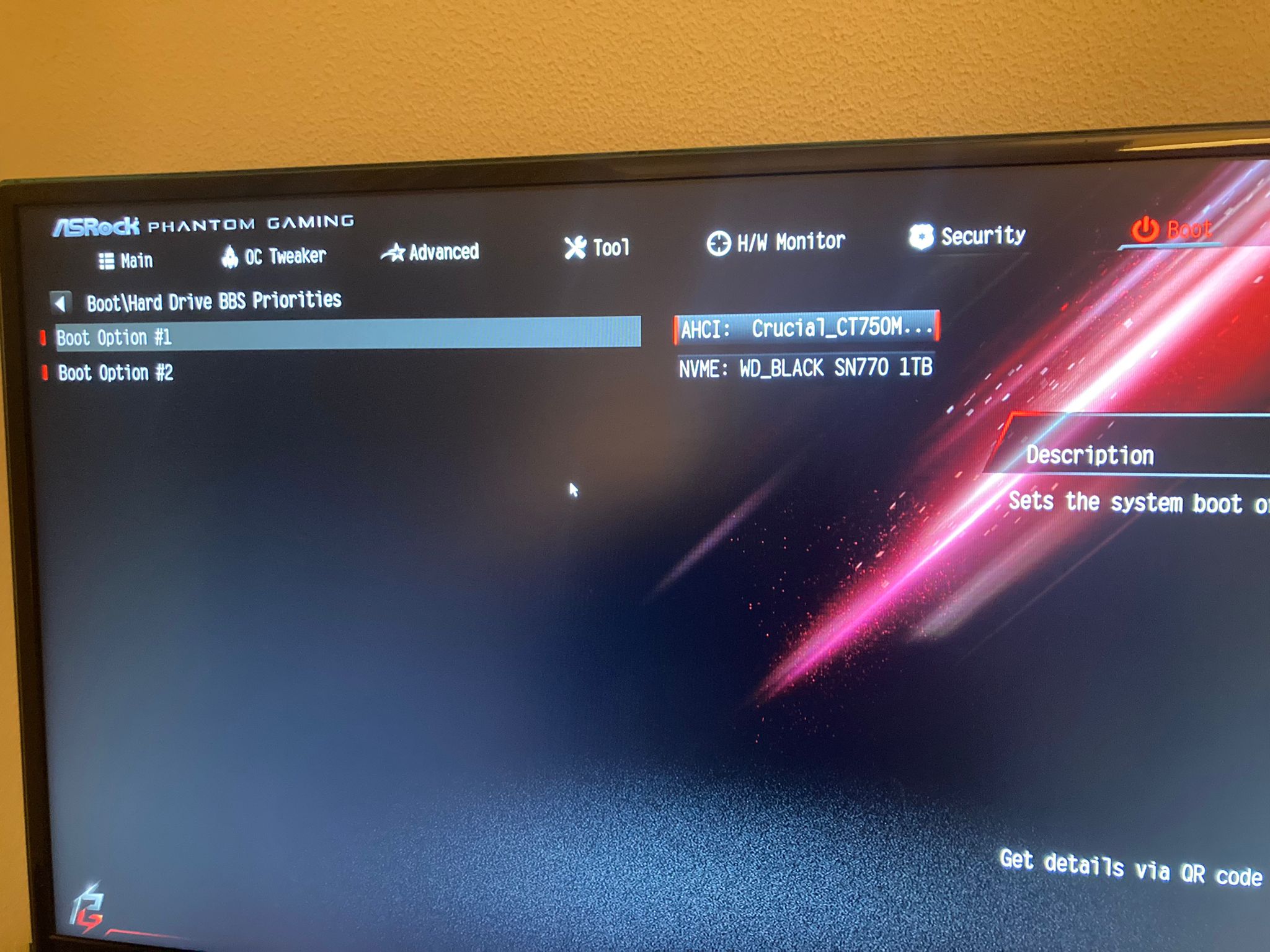 4.) Falls nötig: Im Bios die Bootreihenfolge auf S-ATA 01 stellen (dort wo die alte SSD angeschlossen ist)