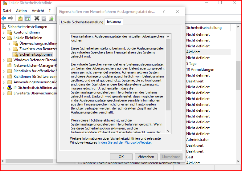 kann mir jemand sagen, wie ich unter Windows10, die Einstellung "Auslagerungsdatei beim Herunterfahren löschen" aktivieren kann?