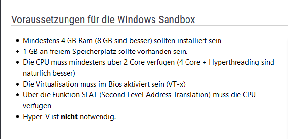 Daraufhin lief die Sandboxie nicht mehr. Hab dann die Version 5.30 draufgemacht. Lief damit wieder. Zusätzlich bitbox installiert inkl. VM Orecal. Die bitbox lief aber nicht, wegen Einstellungen im BIOS. Dort habe ich allerdings nichts geändert.