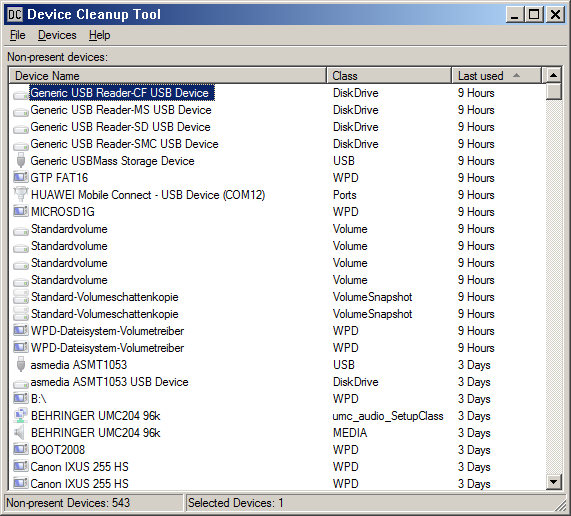 Oder ohne Administrator-Rechte starten, dann wechselt es nach Rückfrage in den Testmode. Mit Adminrechten und ohne Parameter gestartet legt es gleich los. Um gezielt nur bestimmte Typen zu bereinigen gibts noch die Parameter -u -d -c -f -v -w -r, siehe DriveCleanup.txt. Standalone gestartet wird am Ende auf einen Tastendruck gewartet, das kann man mit Parameter -n übergehen oder indem man es minimiert oder versteckt startet. Ab V1.0 werden auch Nicht-USB-Laufwerke entfernt, wenn sie eine RemovalPolicy > 1 haben ( EXPECT_ORDERLY_REMOVAL oder EXPECT_SURPRISE_REMOVAL). Download aktuelle V1.6.1: DriveCleanup.zip