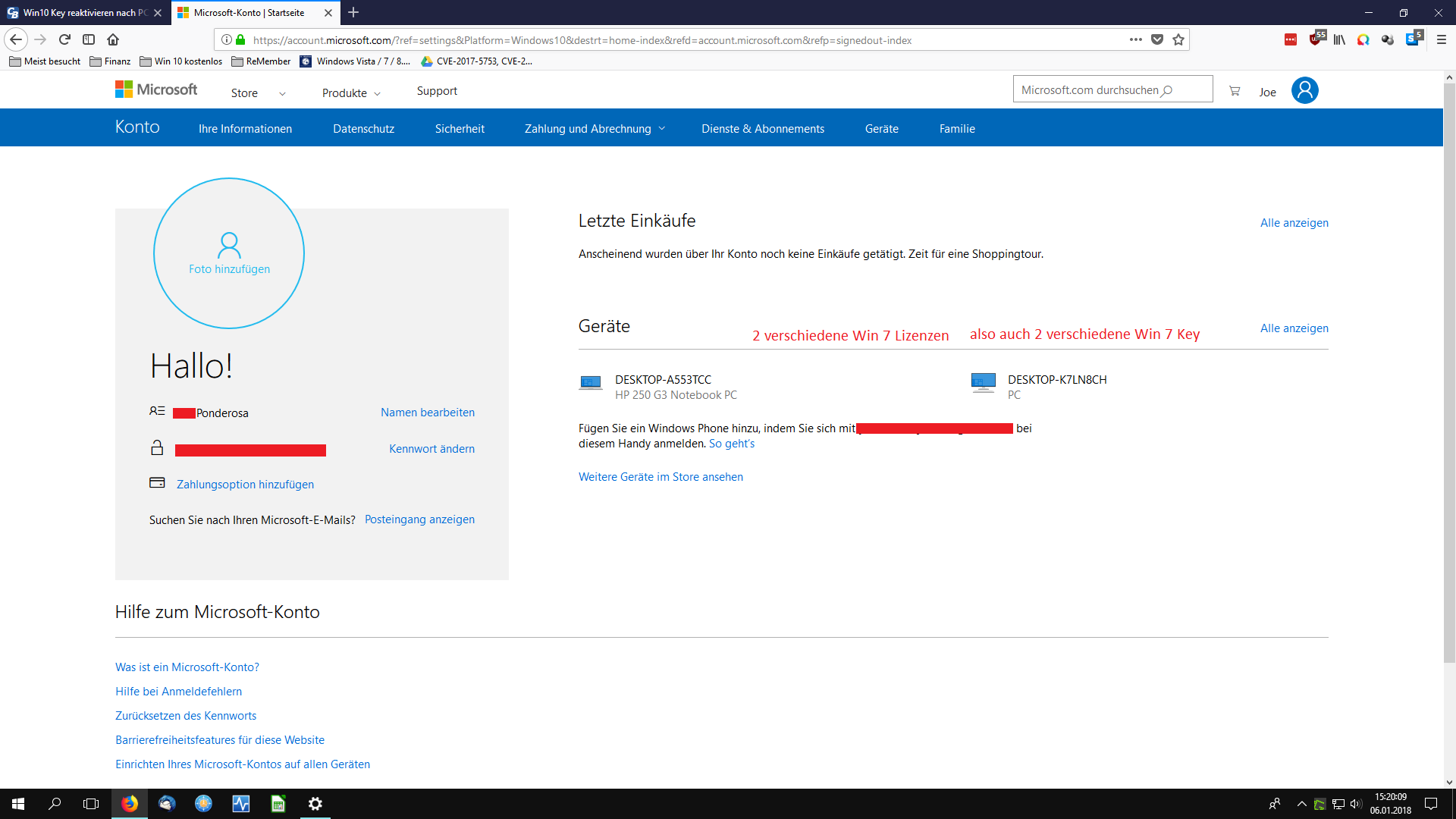 Jetzt habe ich entdeckt, dass in meinem Microsoft Account noch die alte Version mit meinem alten PC eingetragen ist. Ich bräuchte zufällig gerade noch eine Win10 Lizenz und würde nun gerne wissen, ob ich diese alte Lizenz, die an den defekten Rechner gekoppelt war, reaktivieren kann? Also, ob ich die Bindung an den alten PC aufgeben bzw. den Key noch auslesen kann. Wenn ich mich richtig erinnere, war das eine Version, die ich damals von Win 7 upgegradet hatte.