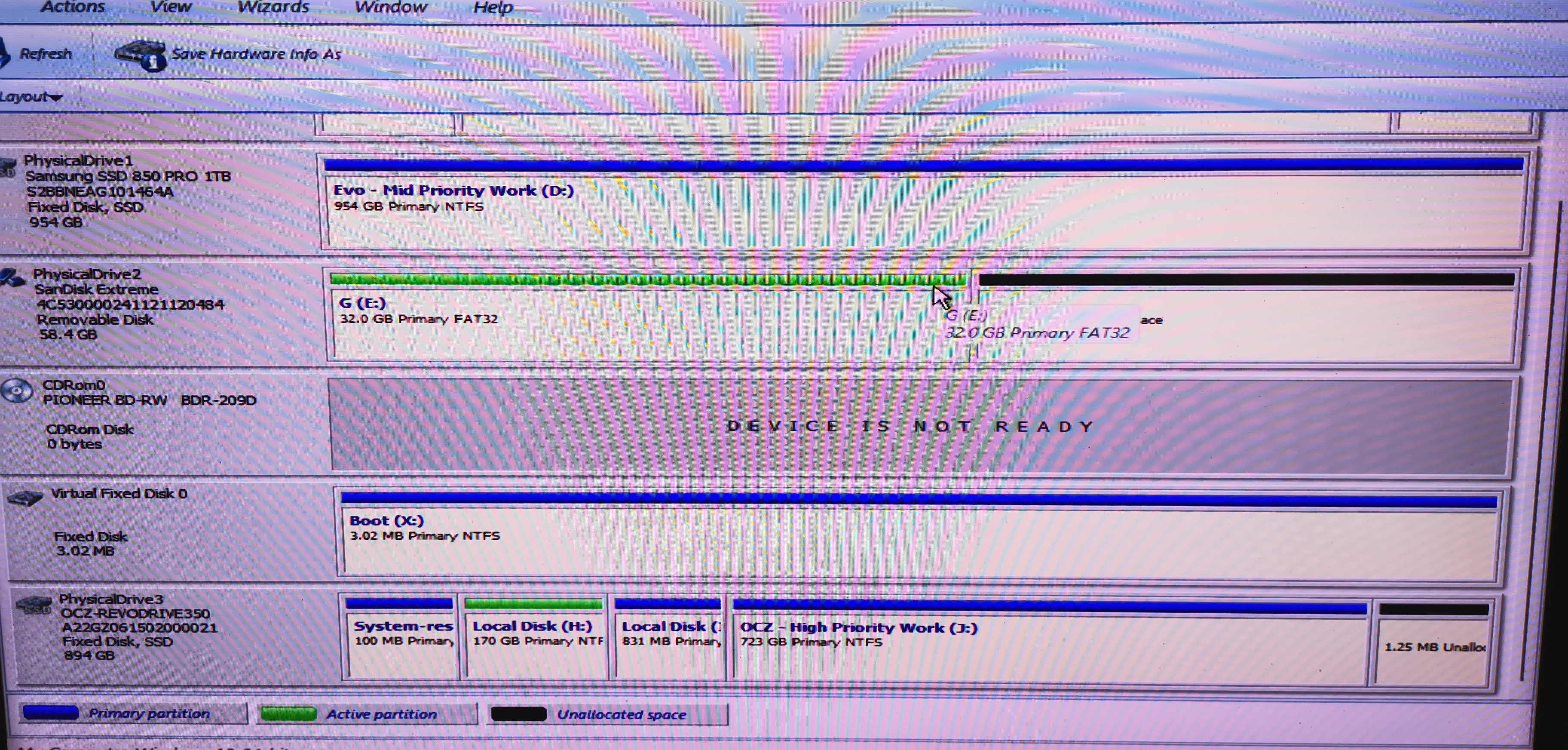 GParted wiederum (ja, ich habe heute ganz viele bootfähige Sticks erstellt, yay) zeigt mir die SSD an, aber in gleichmäßige 223,57 GB-zerteilte Häppchen, die angeblich nicht zugeteilt sind, und für welche ich laut Programm erst eine Partitionstabelle erstellen solle. Supi.
