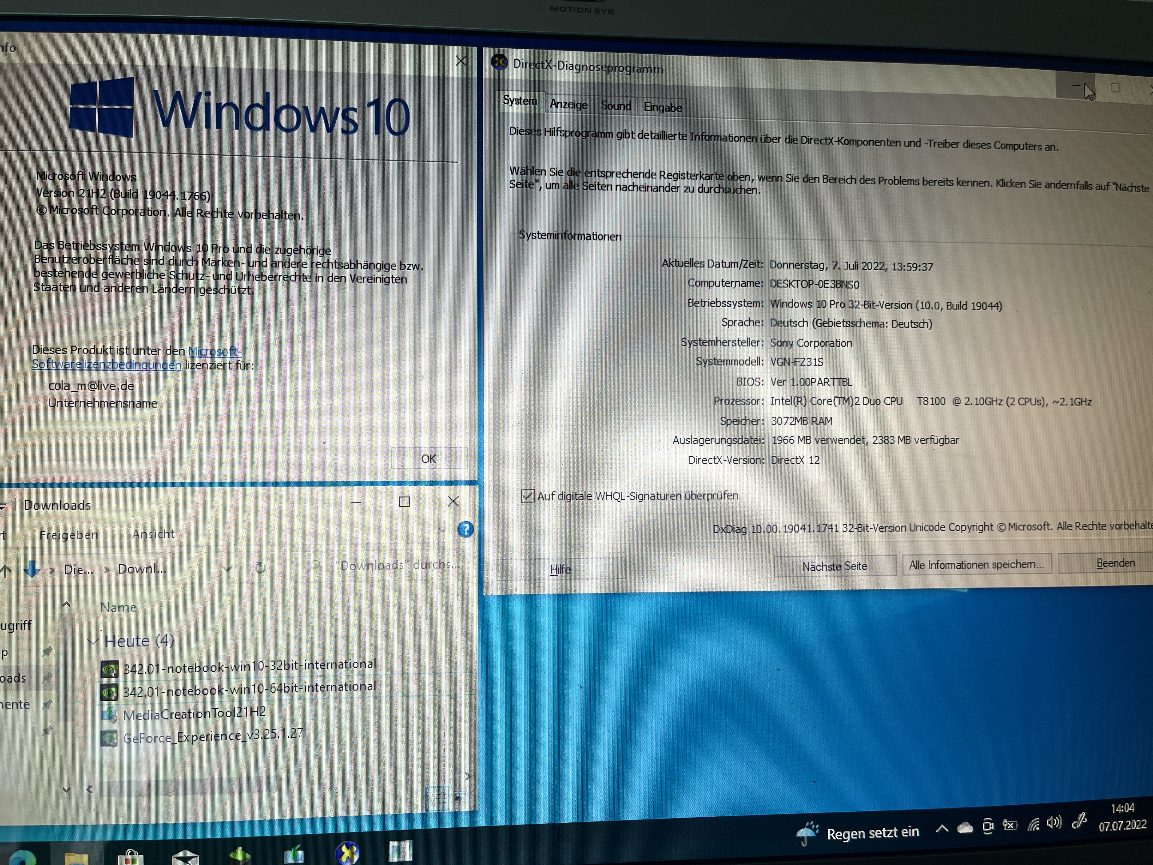 Ich habe ein älteres Laptop (Sony vaio vgn fz31s) mit Nvidia GeForce 8600m gs einer Windows 10 32bit Installation (Version 21h2, Build 19044.1766). Der Systemtyp is ein x64 basierter Prozessor.