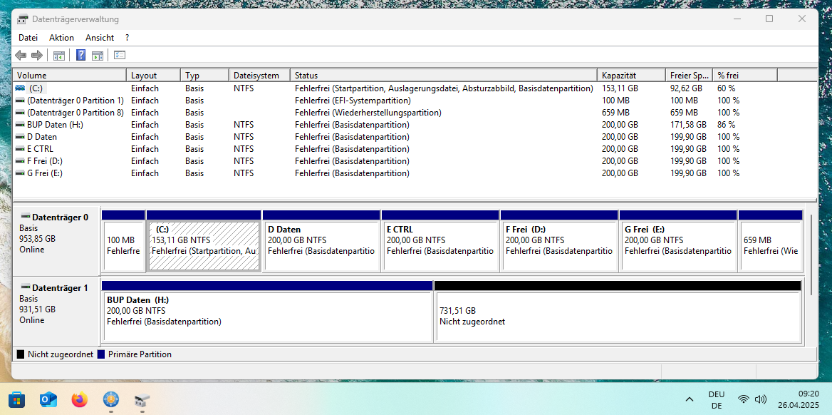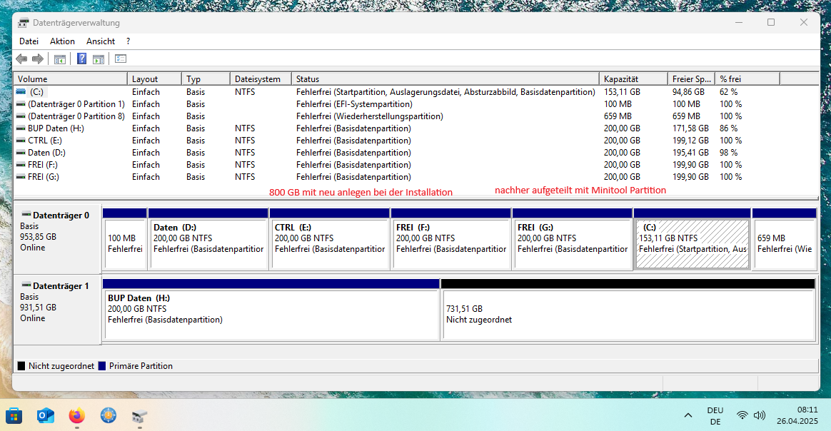 Diese vorgefertigte Partition, mit 800 GB von 953 GB freier Partition, habe ich auf Desktop PC erstellt, danach Windows auf der freien 153 GB Partition installiert.Volume Z schrieb:Aber diese Partition kannst Du nicht im Setup-Fenster erzeugen.