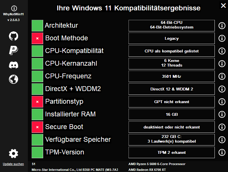 Entsprechend wird mir beim Upgrade-Check für Win 11 angezeigt, dass eine Upgrade nur mit dem UEFI Boot möglich ist.