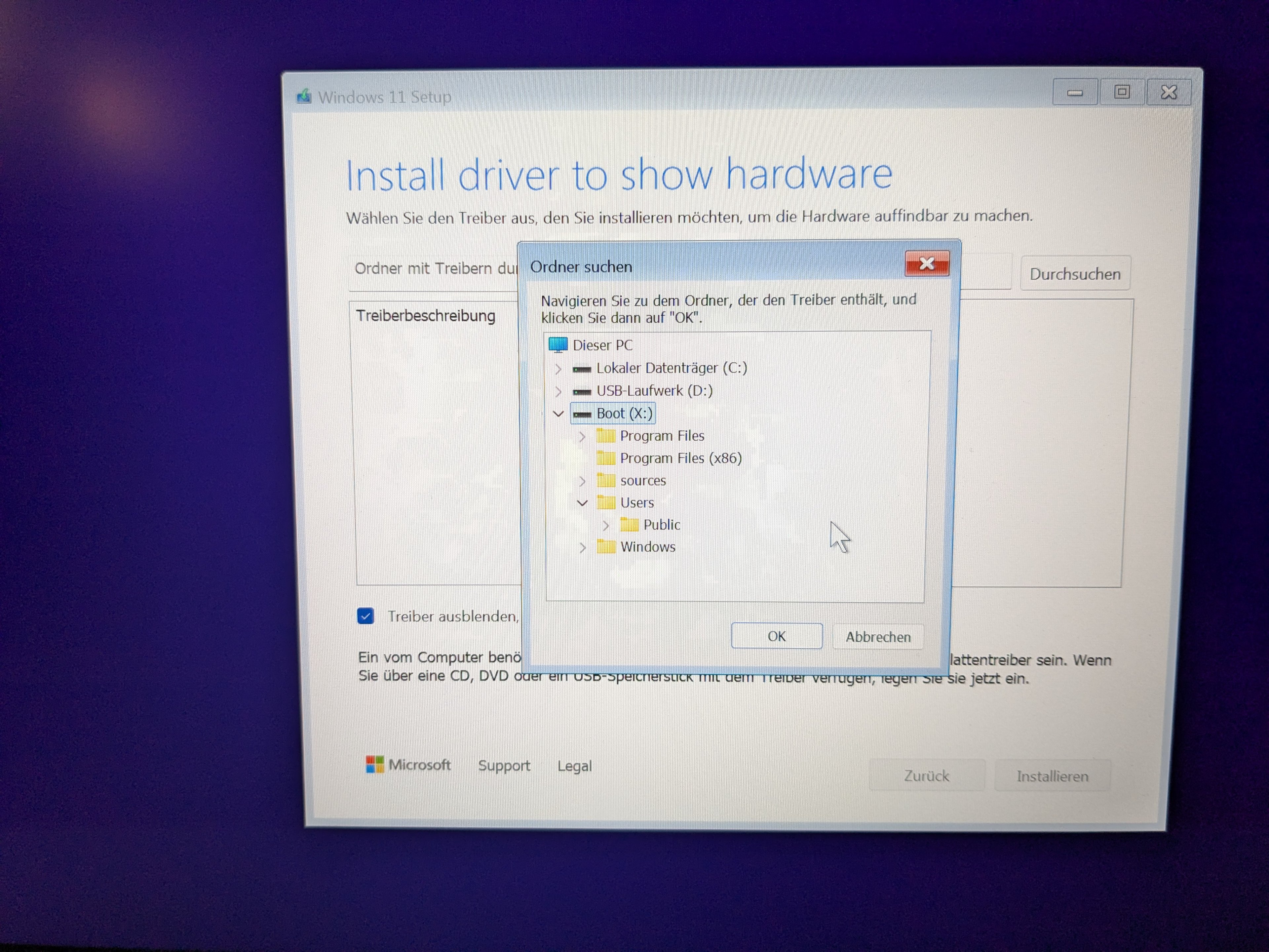 - Klicke ich auf "Treiber durchsuchen", kann ich gar nicht auf den USB-Stick zugreifen - bei C und D kommt die Aufforderung, zu formatieren. X stimmt aber auch nicht ganz mit der Systempartition überein, da ich ja bereits einen Benutzer angelegt habe. Hier bin ich etwas verwirrt.