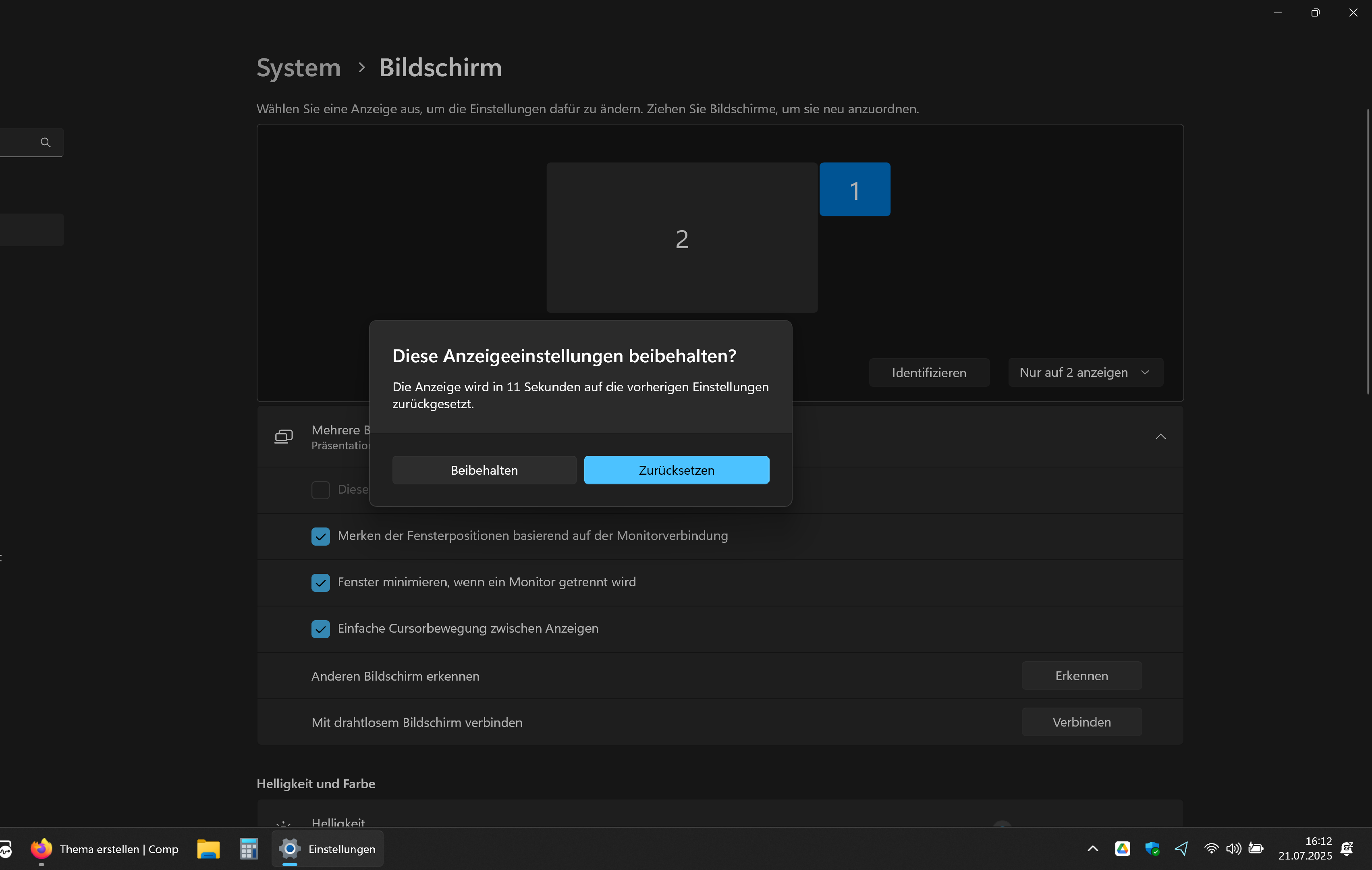 Gehe ich hier auf "Nur auf 2 anzeigen", dann kommt kurz auf beiden Bildschirmen diese Ansicht: