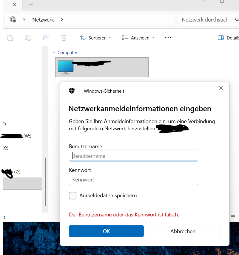 Auch wenn ich die Windowsanmeldedaten vom Server eingebe wird der Zugriff verwehrt.