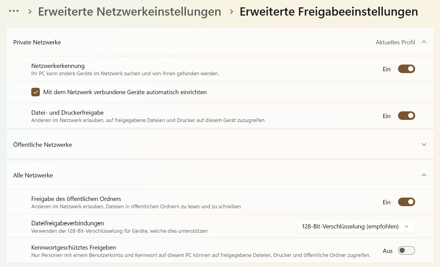 Es sollte jedoch so eingestellt sein, dass kein Kennwort benötigt wird und der Ordner für jeden Freigegeben ist.