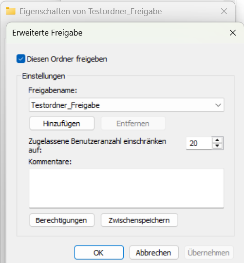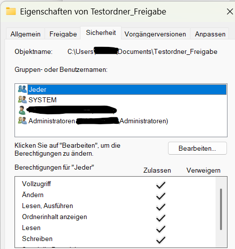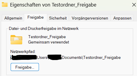 Hatte dann noch testweise einen neuen Ordner erstellt und diesen entsprechend den Informationen die man online dazu findet freigegeben.