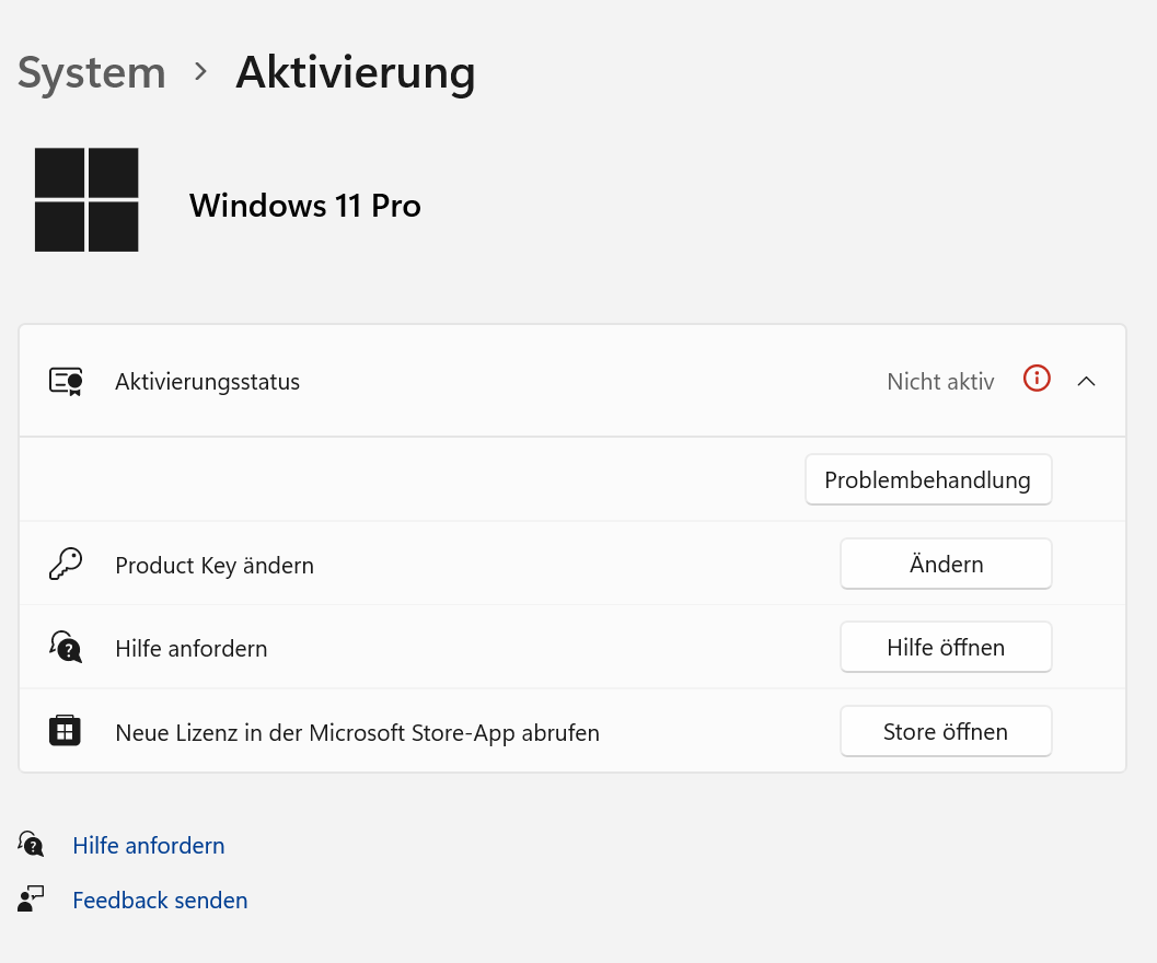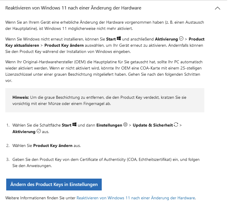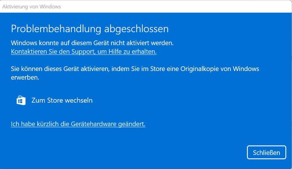 Bei einem Klick auf "Ich habe die Hardware geändert" lande ich wieder auf "Windows kann nicht aktiviert werden".