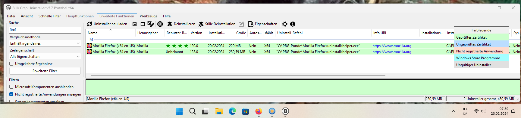 Ich möchte aus alter Gewohnheit die Browser nicht auf C haben, beim Firefox hat es funktioniert, auch wenn ich seit dem letzten Update 2 Einträge (122.0 und 122.0.1) in den Apps (bzw. der alten Softwareübersicht) habe.