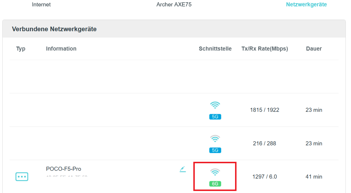 Mein Router ist ein Archer AXE75 v1.0 der kann 6GHz, neuste Firmware. So weit so gut.