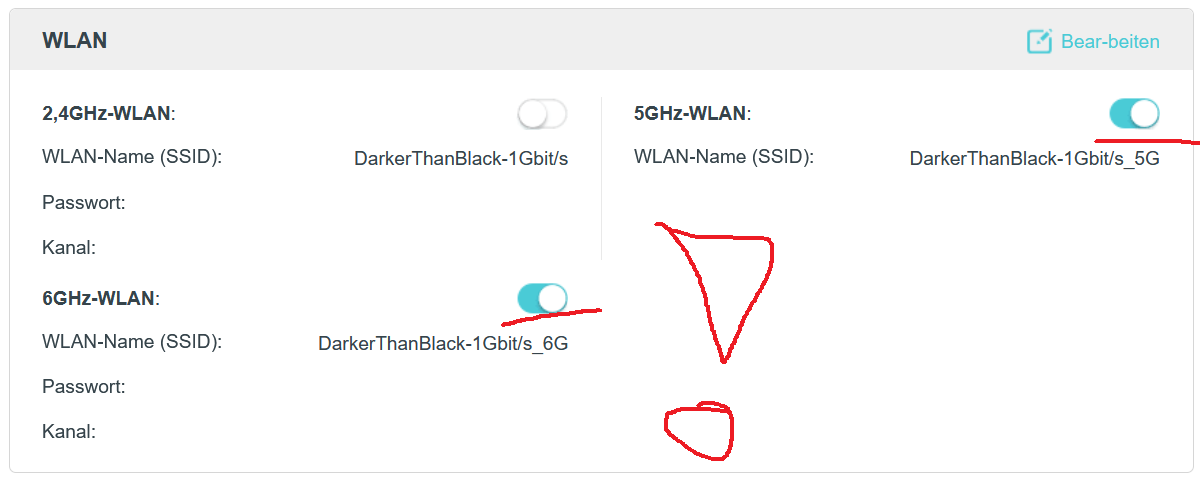 Als ich gerade im Frequenz 6GHz war lief das Inet gar nicht. Aber so konnte ich euch die Daten wenigstens liefern. Sehr Merkwürdig, verstehe gerade nur Bahnhof. Also bei 6GHz kann ich Verbinden hatte eben trotzdem kein Internet.