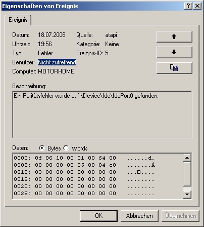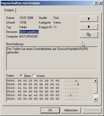 der eventviewer von win2000 gibt immer mal wieder meldungen in die richtung raus (s.anhang) - zumindest denke ich das. ich kann die festplattenbezeichnung in der meldung leider nicht 100% zuordnen.