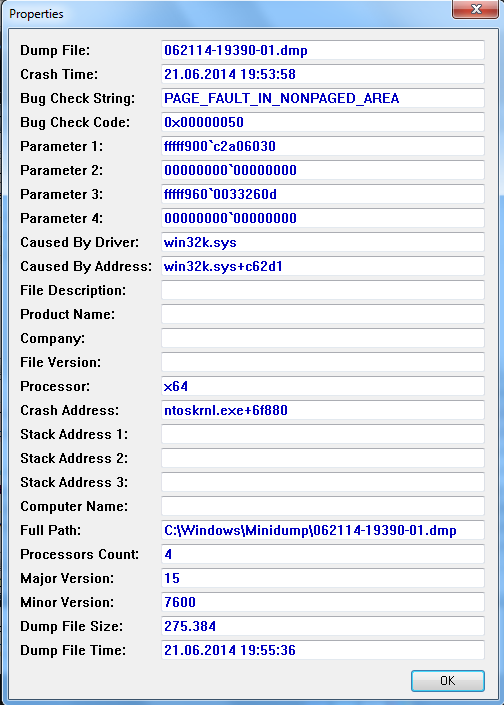 Ich bekomme seit kurzem in unregelmäßigen Abständen immer die Fehlermeldung "Page Fault in nonpaged Area" via Bluescreen. Dabei steht außerdem im Titel noch "Win32k.sys".