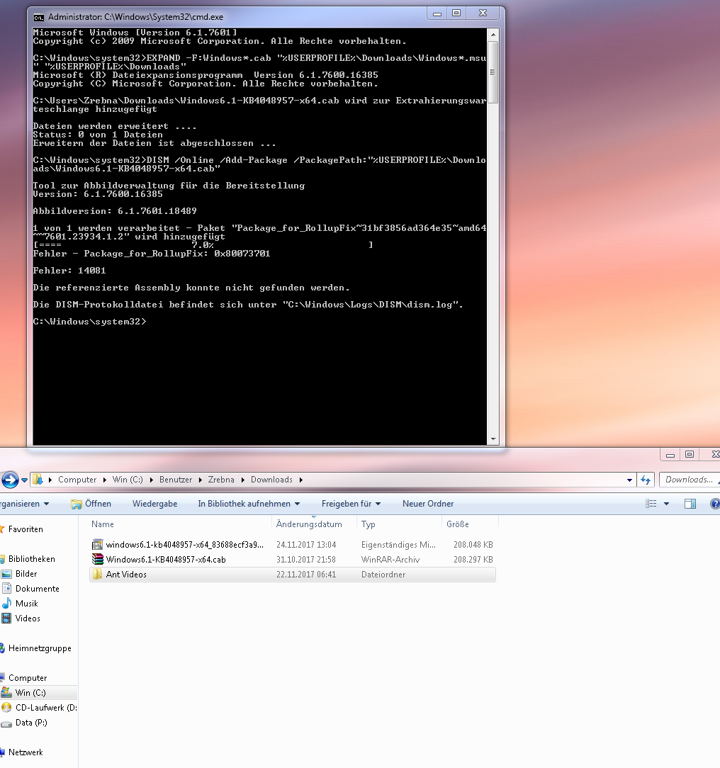 Lade Dir dazu zuerst hier Download das Rollup Update KB4048957 herunter und speichere es in den standardmäßig vorgegeben Ordner Downloads ab. Öffne nun die Eingabeaufforderung (cmd.exe) mit erhöhten Rechten und gib nacheinander folgende Befehle ein: