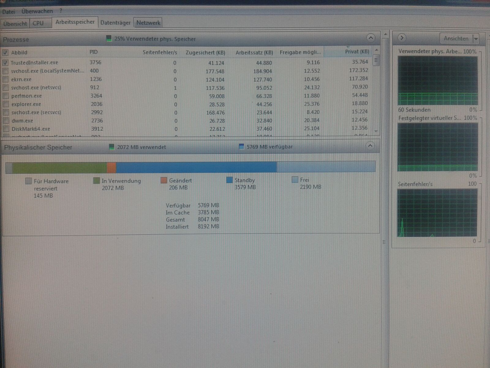 - Check Taskmanager: Im Ruhezustand werden 1,6 von 8 GB RAM benötigt. CPU Auslastung im Ruhezustand schwankt zwischen 16% und 60% (im Mittel 30%)
