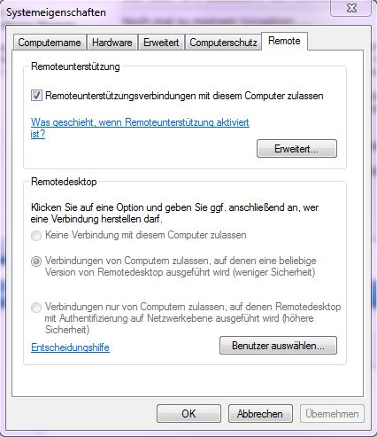 Habe heute auf meinen beiden Systemen das ServicePack 1 für Windows 7 installiert, ein System läuft nur im Hintergrund und wird nur per RemoteDesktop gesteuert. Hatte vor dem SP1 auch alles fehlerfrei funktioniert. Der notwendigen Dienste laufen, der User ist Mitglied der Adminstratoren und der Remotedesktopuser und alle notwendigen Häkchen (Screenshot) sind gesetzt. Dann erhalte ich die Fehlermeldung "abgewiesen", die Netzwerkfreigabe, Netzwerklaufwerke, PING, alles funktioniert nur RDP nicht mehr.